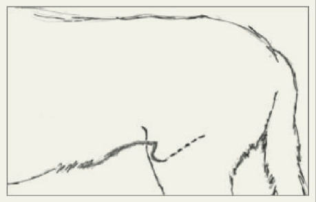 For most male dogs, the conventional belly band fits in front of the hind legs, behind the penis.